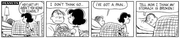 Lins' son has a pain in his stomach so has to stay at home and says that he thinks his stomach is broken.