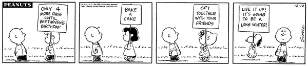 Schroeder puts up a sign announcing that there are four days until Beethoven's Birthday and Lucy, Sally and Snoopy put up signs saying how to celebrate it.CB 3417 Lucy 1899 Snoopy 1647 Linus 1502 Schroeder 645 Sally 125 Frieda 86 555 24