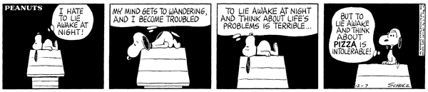 Snoop complains about how he lies awake at night thinking about life's problems which is almost as bad as thinking about pizza.