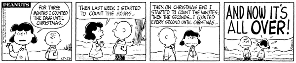 Luucy's daughter realizes that after counting how long it would be till Christmas for three months and now it is all over.CB 3424 Lucy 1902 Snoopy 1654 Linus 1508