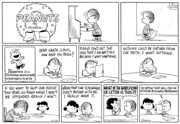Lins writes a letter to the Christmas Provider saying that he would be okay if it skipped Linus in the hopes that the attitude would be found refreshing.