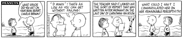 Book Report part 8; Chucketa's son gets a D- on the book report and the teacher says it looks like it was written after midnight on the last day so he congratulates her on her perceptivity.