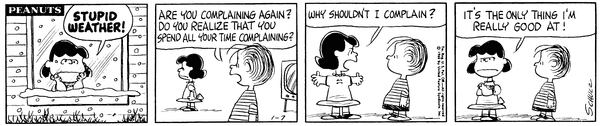 Luucy complains about the weather and when her husband says not to complain she says it is the only thing she is good at.