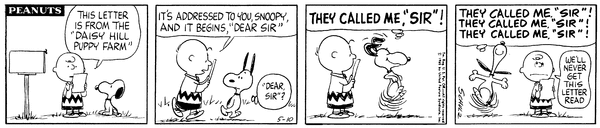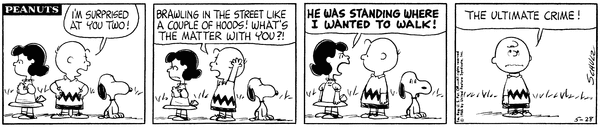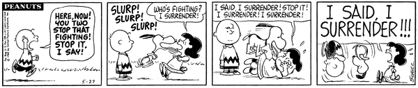 One Versus One part 6; Chuc congratulates Snoop on standing up to Luucy and wants to shake his hand but is afraid of getting hit by her.CB 3497 Lucy 1961 Snoopy 1732 Frieda 101 555 27
