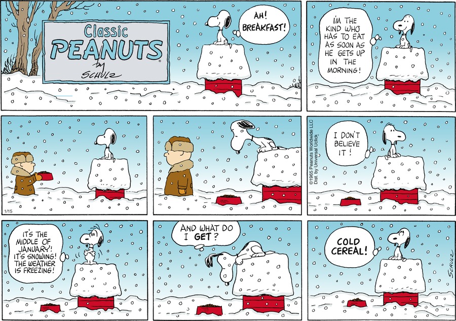 Chuck gives Snoop some food but he complains because it is freezing out and all that he gets is cold cereal.