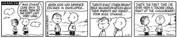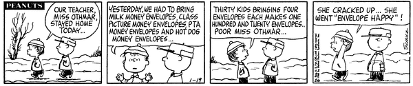 Envelopes part 3 (Miss Othmar part 41); The person in charge of paperwork goes back to work but gets more envelopes and climbs up a chalkboard (she later quits this job).