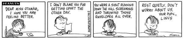 Envelopes part 2 (Miss Othmar part 40); Lins writes an apology letter to Miss Othmar about what happened and hopes that the person in charge of paperwork will feel better.
