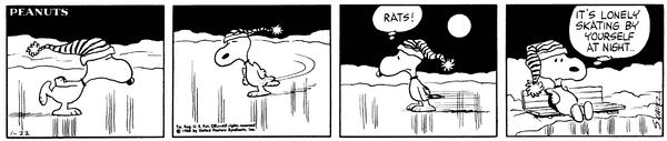 Fiancé part 1; Snoop skates along the Peanutsville ice pond on his feet but decides that it is lonely to skate by yourself at night.