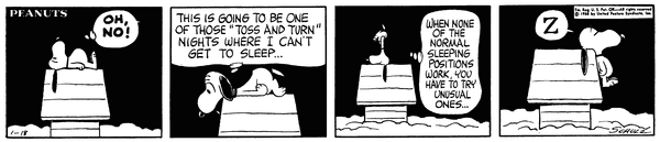 Snoop tosses and turns all night and can't get to sleep in normal position and tries unusual one like upside down or on the side of the house.