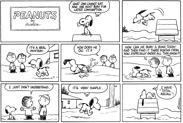 19650131                        The Snoopy Scavengers bury some food in the snow and Linus' wall commander wonder how they will remember it they explain that they just have total recall.