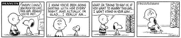 19650204                         Fiance part 12; Snoop tells Schulz that he is going to ask his girlfriend to marry her and asks him to wish him luck. She then says yes to his proposal.