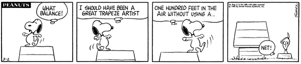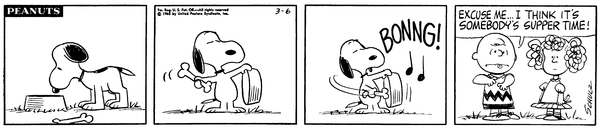 The Snoopy Scavengers find their food container's empty so they bong it like a drum which makes Charlie Brown realize it is suppertime.CB 3454 Lucy 1922 Snoopy 1693 Linus 1527 Frieda 92