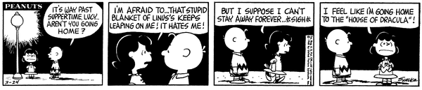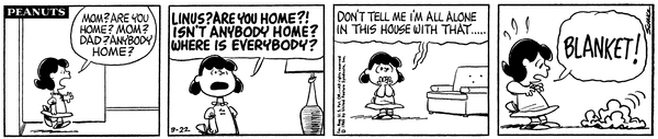 Angry Blanket part 12; Charlie Brown's general wonders why Lu hasn't returned to the Van Pelt convergence and she says it is because she's afraid of the wall but eventually she returns.