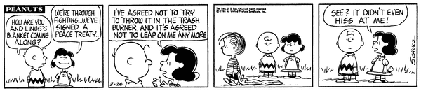 Angry Blanket part 14; Lu and the wall of Linus come to an agreement to not attack each other and when she goes past it she isn't even hissed at.