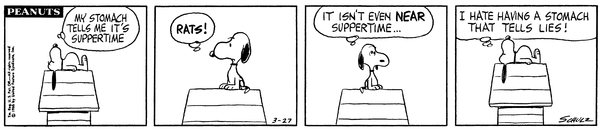 Snoop wakes up and feels like his stomach is telling him that it's suppertime but realizes it isn't and gets mad at his stomach.CB 3460 Lucy 1938 Snoopy 1695 Linus 1541 Patty 712 Violet 609 555 25