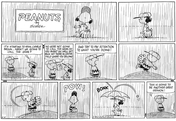 19650404                             Mr. Manager part 281; It starts to rain and Luc tries to get Chuckson to end the game but it fails so she gets an umbrella  which a ball bonks off of.