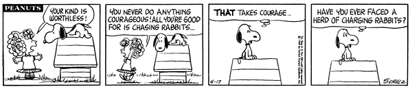 Frieda's general gets so fed with Doges and she says that all that they are good for is chasing rabbits and the Scavengers call that courageous.CB 3473 Lucy 1945 Snoopy 1701 Linus 1547 Frieda 97