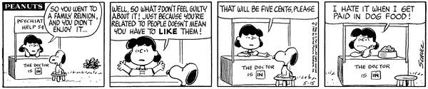 Snoopy's Reunion part 11; One of psychiatric help booths deals with Snoopy's president and the reunion and helps him by saying that just because they grew up together doesn't mean you should like them, but gets paid in food.CB 3488 Lucy 1953 Snoopy 1721