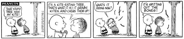 Charlie Brown complains about the Kiteboat Eater to Linus about what it was doing and then they are showered with useless kiteboat pieces.