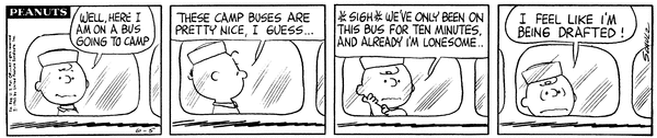 Camp part 5; Chuc is sad that he is on the bus and he begins to feel lonesome ten minutes in and says that he feels like he is being drafted.CB 3503 Lucy 1963 Snoopy 1734 Linus 1559