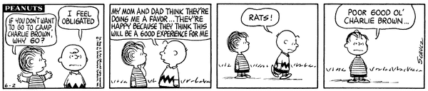 Camp part 2; Lins asks why Chuck is going if he doesn't want to and he says because Charlie Brown thinks it will be a good experience for them.