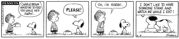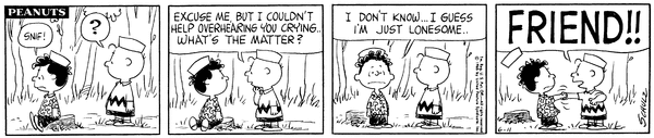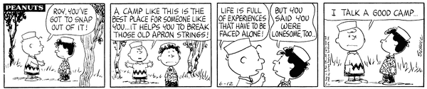 Camp part 11; Chuck tries to give a speech to Roy's representative (Ro) about how sometimes you have to face challenges alone but Ro points out that he is lonesome too, and he has friends here.CB 3508 Snoopy 1736 Linus 1560 Roy 2