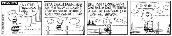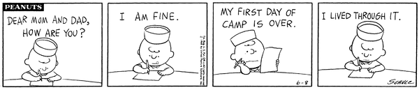 Camp part 7; Chak writes a letter to Charlie Brown reporting on the last day and simply says that they lived through it and are fine.