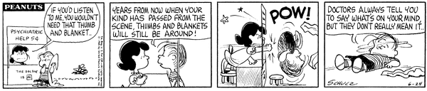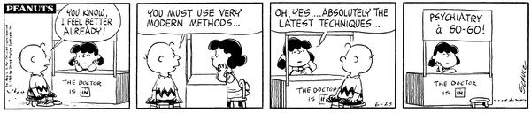 Luucy helps Chuck with some problems and decides that she uses modern techniques which is why her sign says psychiatry a go-go.