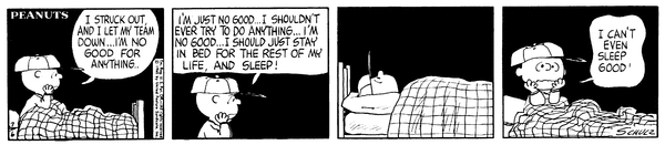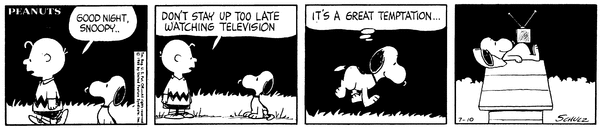 Chuck says good night to Snoop and advises him to not watch too much TV but he is unable to resist the temptation.CB 3529 Lucy 1973 Snoopy 1744 Linus 1567 Schroeder 659