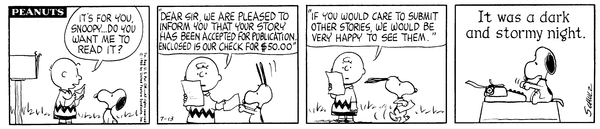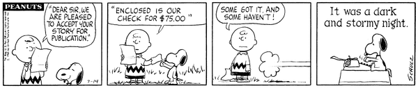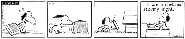 World's Greatest Author part 1; A Snoopian author (nicknamed the WGA) moves into Peanutsville and begins his first book by writing "It was a dark and stormy night."