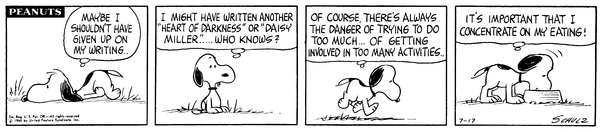 World's Greatest Author part 6; The WGA debates whether or not he should have given up writing but decides that it is important to concentrate on eating.CB 3533 Lucy 1974 Snoopy 1750 Linus 1569