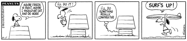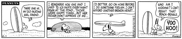 Beach Beagle part 3 (Fiance part 21); Snoop reflects on his engagement and decides to leave, but then he realizes that he can't resist her and decides to impress her.CB 3541 Lucy 1984 Snoopy 1760 Schroeder 661 Violet 613 Frieda 105