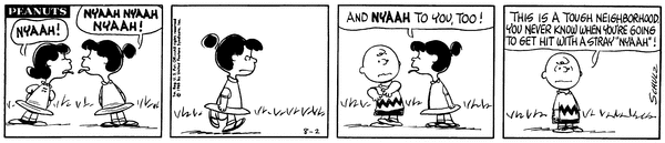Luucy and Biole have a fight and nyaah at each other and when Biole passes by Chuck she nyaah's at him too and so he calls it a tough neighborhood because nyaah's fly around.