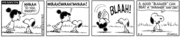 Biole nyaah's a bunch of times at Snoop but he defeats her with a blaah and says that a good blaaher can beat a nyaaher any day.