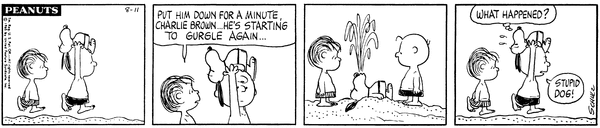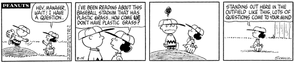 Mr. Manager part 305; Luc comes up to Chuckson and complains how they do not have plastic grass in their fields which annoys him to no end.CB 3548 Lucy 1986 Snoopy 1765 Linus 1583