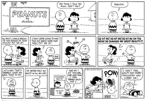 Luucy gets mad at Chuck during debate and tries to fight and so he puts his fist up and hits her, he regrets it and goes to the psychiatric booth for help, but it is Luucy so she punches him.