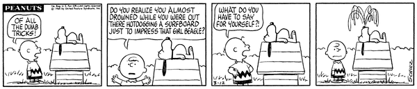 Beach Beagle part 4 (Fiance part 22); Snoop gets out on a surfboard and tries to impress the Beach Beagle and yells cowabunga, Lins and Chuck watch him and decide that he's lost his mind.