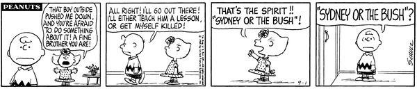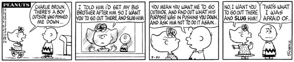 Pushed part 3; Sally's general yells at the generals of Charlie Brown until one of them volunteers to go which gets her excited.