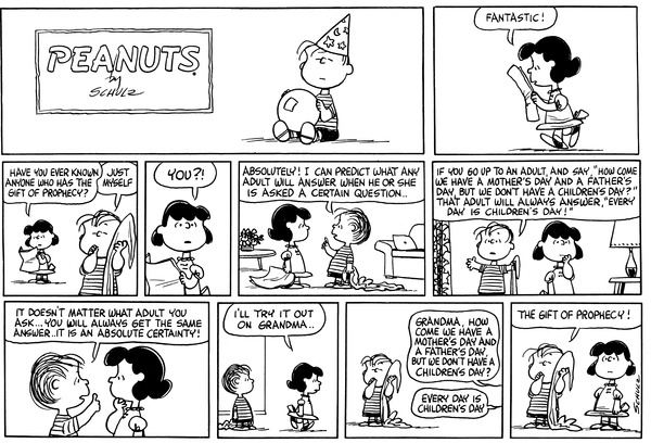 Luucy's daughter wonders if her stepbrother knows anyone who can tell the future and he says that he can, whenever an adult is asked why there is no children's day they will always say every day is children's day and it proves true.