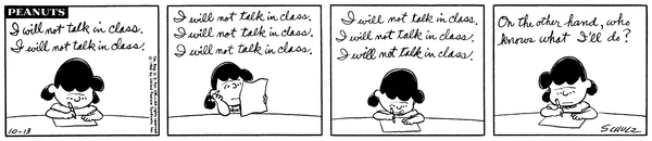 Luucy's daughter gets forced to write that she won't talk in class but after awhile she writes that who knows what she'll do.