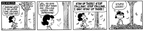 Luucy comes up to a tree that has falling leaves and demands they stop falling and being depressing but they fall on her.
