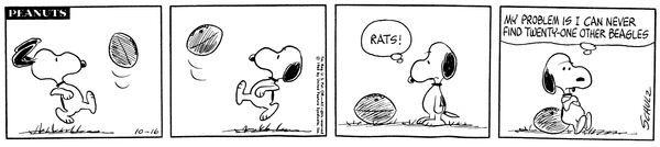 Snoop kicks around a football but gets bored because he doesn't have 21 other Bagle's to play football with.Lucy 2011 Snoopy 1787 Linus 1603 Schroeder 666 XCB 6