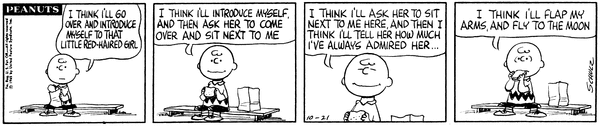 Cham sits at his lunch seat and decides to introduce himself to her and fantasizes about it but gives up and adds that we'll flap his arms and fly to the moon.