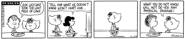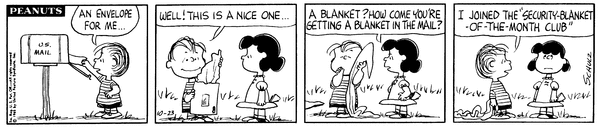 Lins' son gets an envelope with a new security blanket and when his stepsister asks why he says that he joined the security blanket of the month club.CB 3584 Lucy 2014 Snoopy 1790 Linus 1605 Sally 143