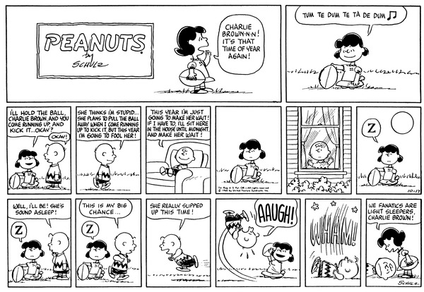 Lucy offers to have Charlie Brown use the football but its challenger decides to wait for the operator to fall asleep and when she does he tries but she wakes up and tricks it.
