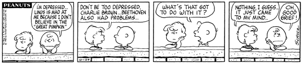 Lins is sitting in a pumpkin patch when Chuck apologizes to him but when Lins offers to wait together they get into another argument.CB 3588 Lucy 2016 Linus 1611 Schroeder 667