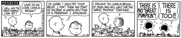 Chuck explains that he doesn't believe in the Great Pumpkin because it has never been seen and thinks Lins has him confused with the Christmas Provider which he denies and compares it confusing the sun and the moon.