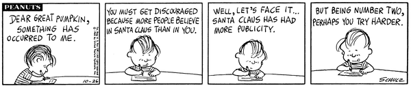 Lins is writing a letter to the Great Pumpkin that says that the Christmas Provider has more publicity making it number two it try's harder.