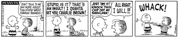 Chuck gets angry about Lins talking about the Great Pumpkin and Lins threatens to hit him and so he knocks a chip off his soldier with his blanket.