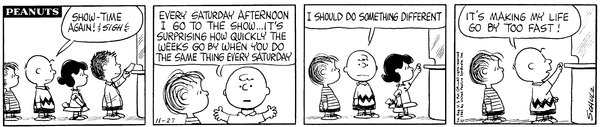 19651127                        Charlie Brown is ordering movies to enter the country and the person in charge of it wants to do something different do to the routine but continues to do it anyway.